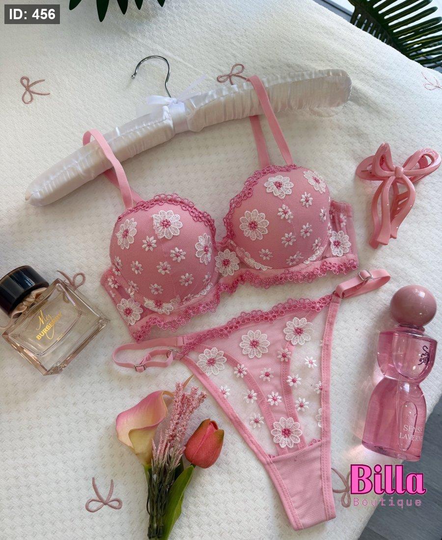طقم داخلي دبل بوش باللون الزهري منقش ورد ابيض 🫰😩💗