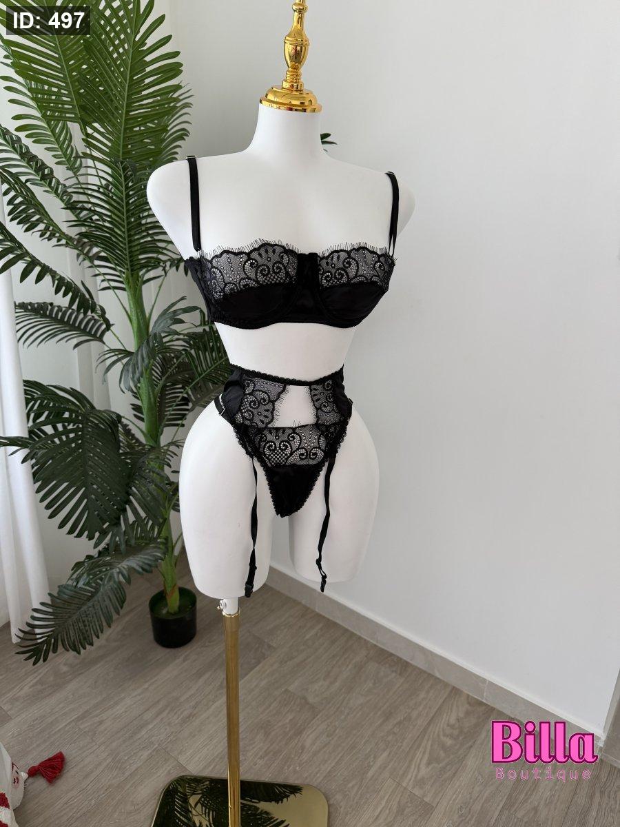 طقم داخلي ثلاث قطع ستان دانتيل والكواليتي❤️‍🔥 باللون الأسود😭🫰🏻❤️‍🔥