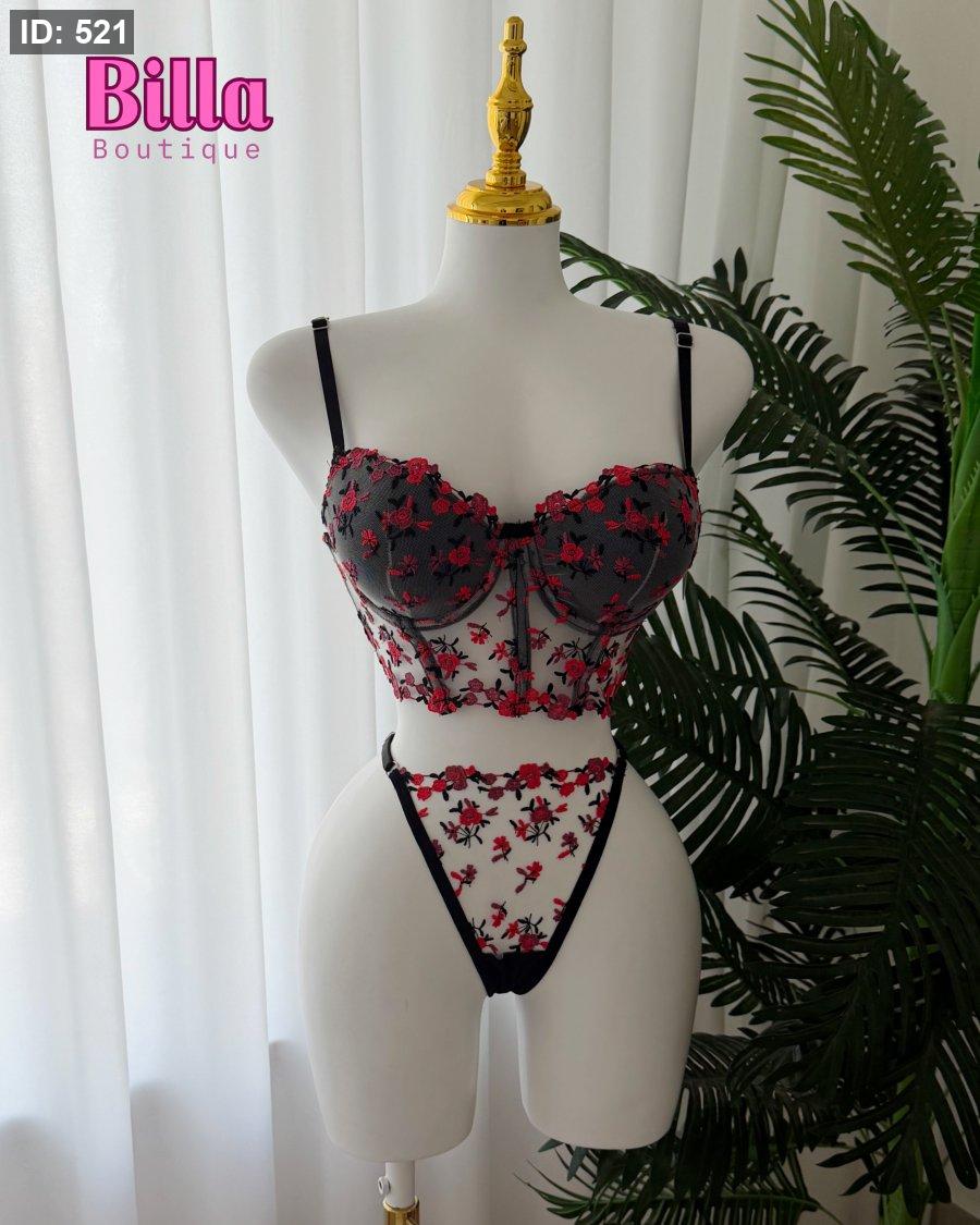 طقم داخلي دبل بوش اسود منقش ورد احمر❤️🫰🏻