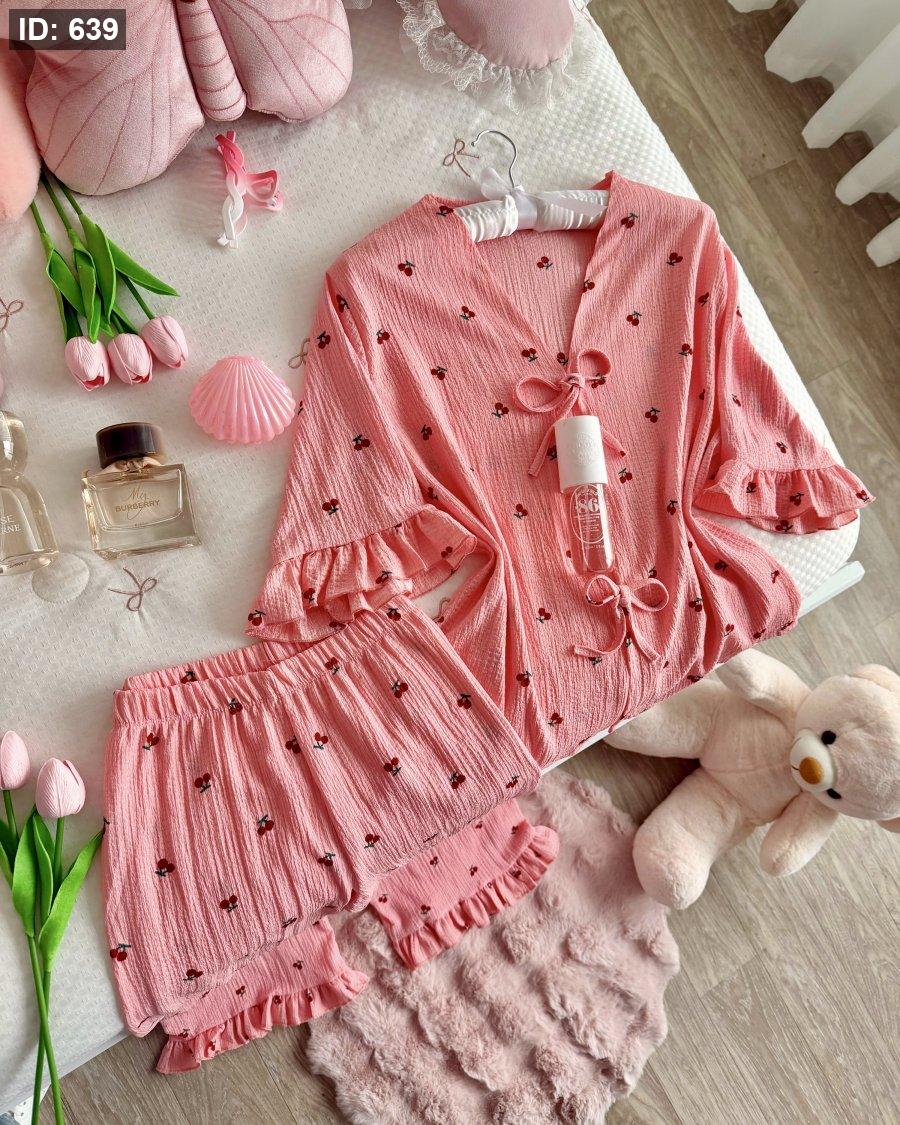 بيجامة بلون الزهري منقشة كرز ثلاث ارباع والكواليتي🔥😭💕🍒