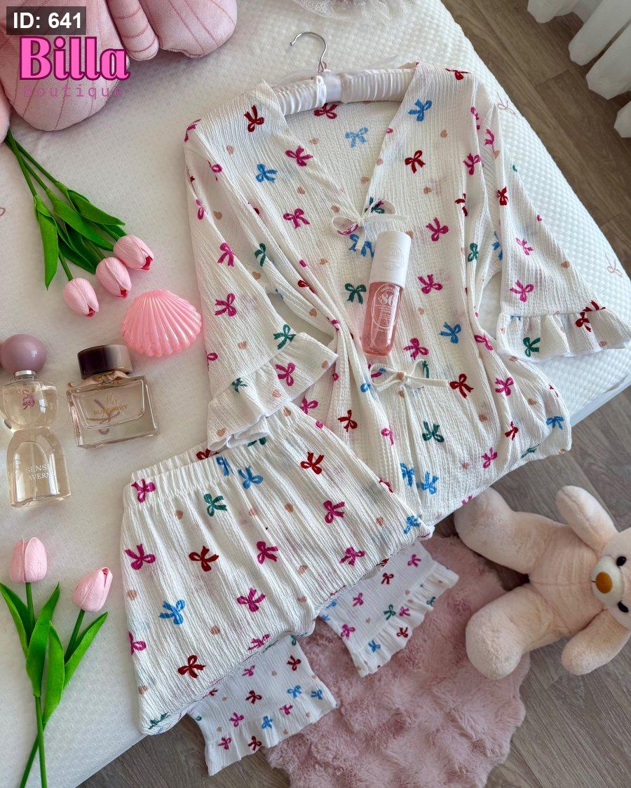 بيجامة ثلاث ارباع منقشة فيونكات بتسطللل😭😭🎀🎀💜♥️💗🎀💕